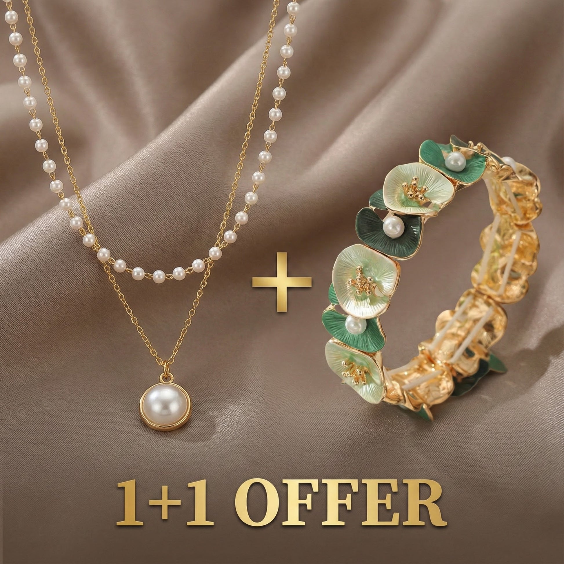 This exclusive 1+1 offer presents two exquisite pieces—the Elegant Pearl Necklace and the Vintage Green Floral Pearl Bracelet—at a refined, special price. Together, they were selected as a design pairing to ensure harmony and versatility across your wardrobe.