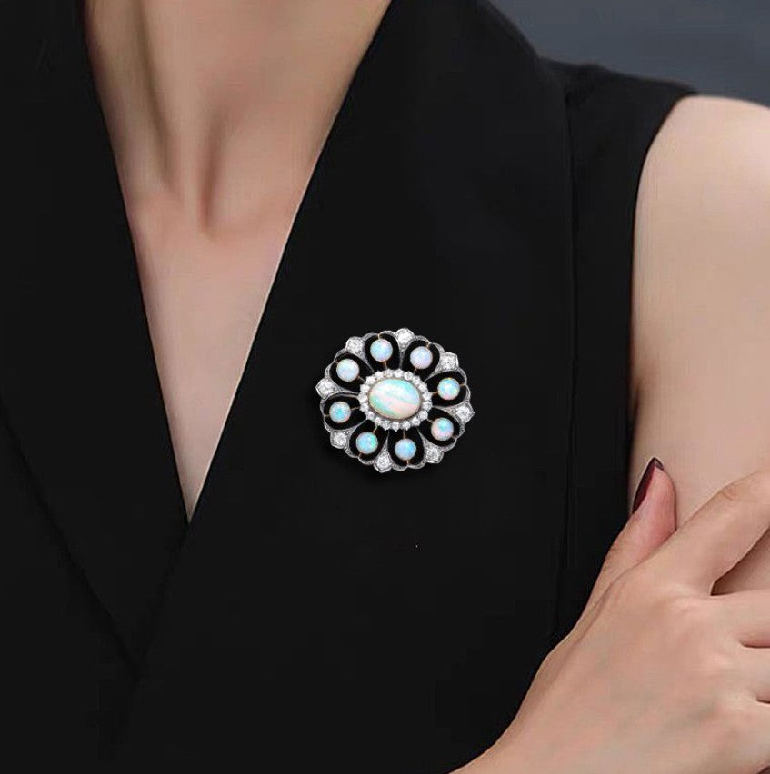 The Antique Two-Tone Halo Oval & Round Opal Brooch embodies an exquisite blend of vintage charm and refined polish. Set in a timeless two-tone frame, this brooch centers a luminous opal, surrounded by a delicate halo that catches the light with every turn of the body.