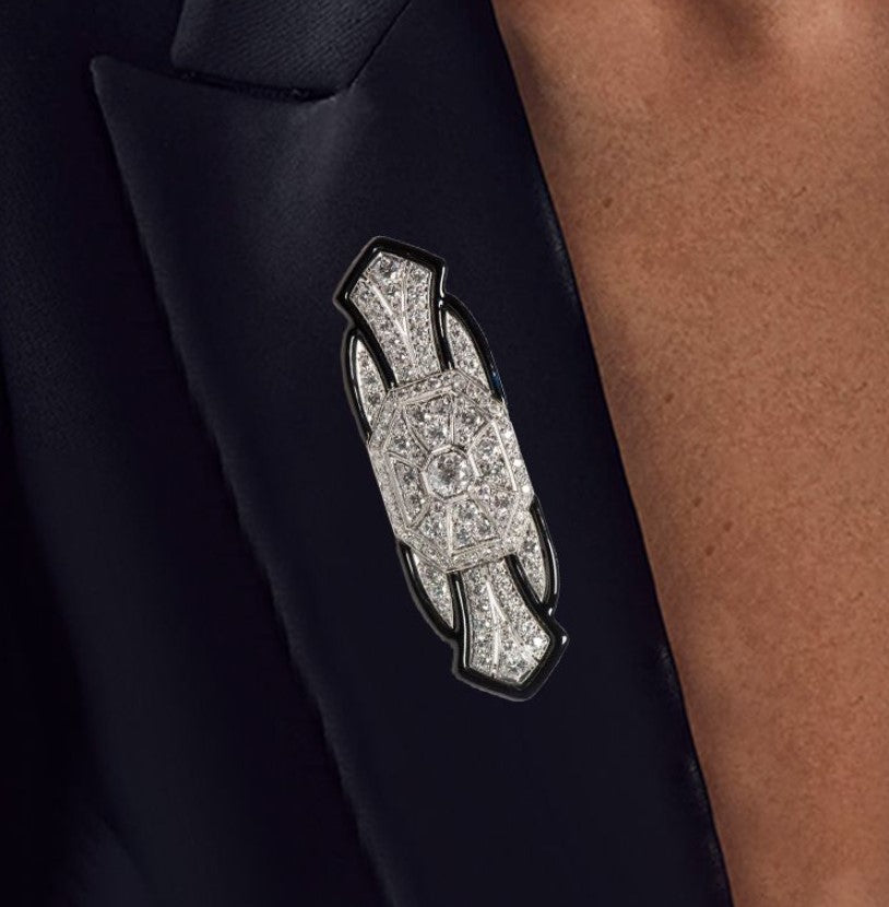 The symmetrical arrangement and crisp lines evoke classic glamour, making it the perfect adornment for a tailored blazer, a velvet evening dress, or a silk scarf, adding polish to daytime looks and radiance to after-dark ensembles.