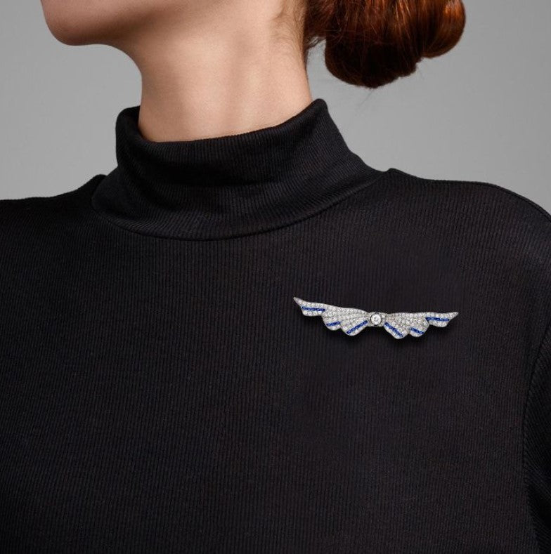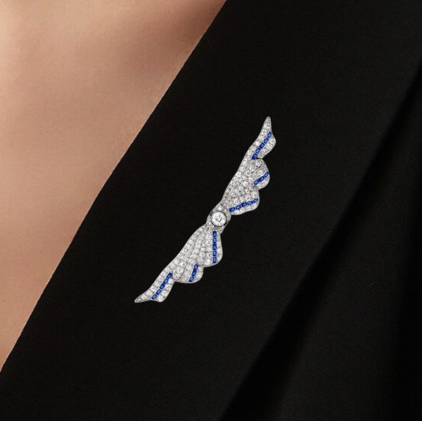 Meticulous craftsmanship meets enduring elegance in this brooch, where light travels through the sapphire to create a quiet radiance that enhances any silhouette. The Art Deco-inspired design brings a sense of structured grace and sophistication to your ensemble, making a statement that is both classic and contemporary.