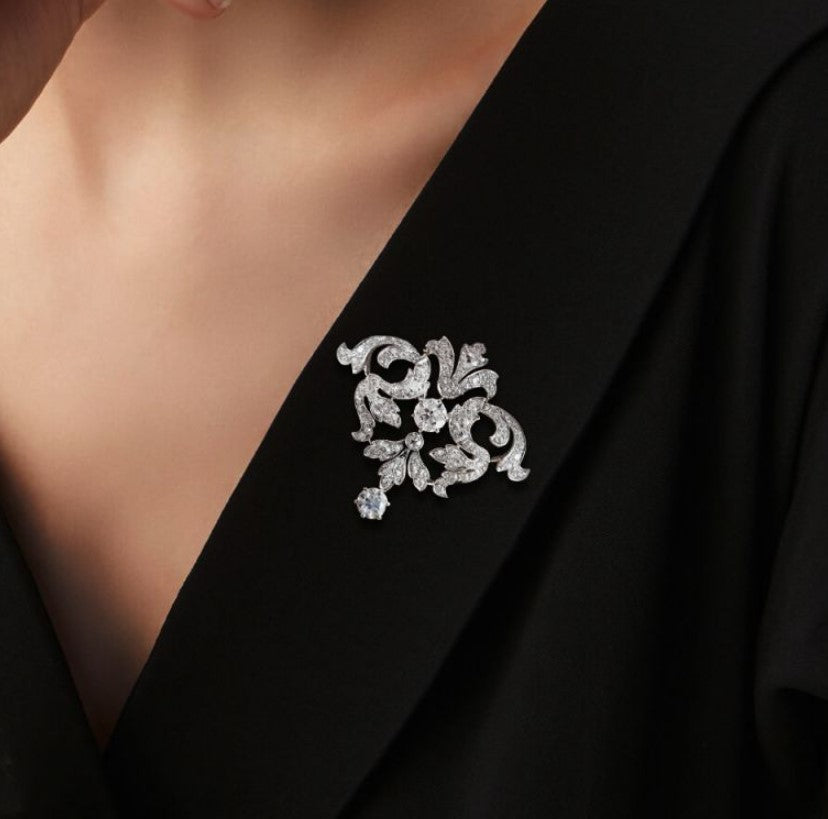 The Vintage Round Cut White Sapphire Brooch embodies an exquisite blend of luxury and timeless charm. This striking piece is thoughtfully designed to showcase a circle of round-cut white sapphires, set to catch the light with every movement and to elevate the wearer’s refined sense of style.